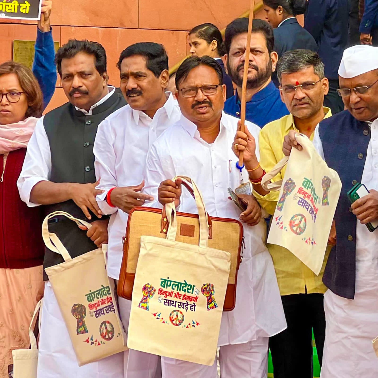 बांगलादेशात हिंदू आणि ख्रिश्चनांवर होणाऱ्या अत्याचारावर केंद्र सरकार बोलत नाही म्हणून खासदारांनी हातात बांगलादेशातील हिंदू आणि ख्रिश्चनांच्या पाठीशी उभे रहा असे लिहिलेल्या बॅग हाती घेत आंदोलन केले. काँग्रेसच्या खासदार प्रियंका गांधीही या आंदोलनात सहभागी झाल्या होत्या.