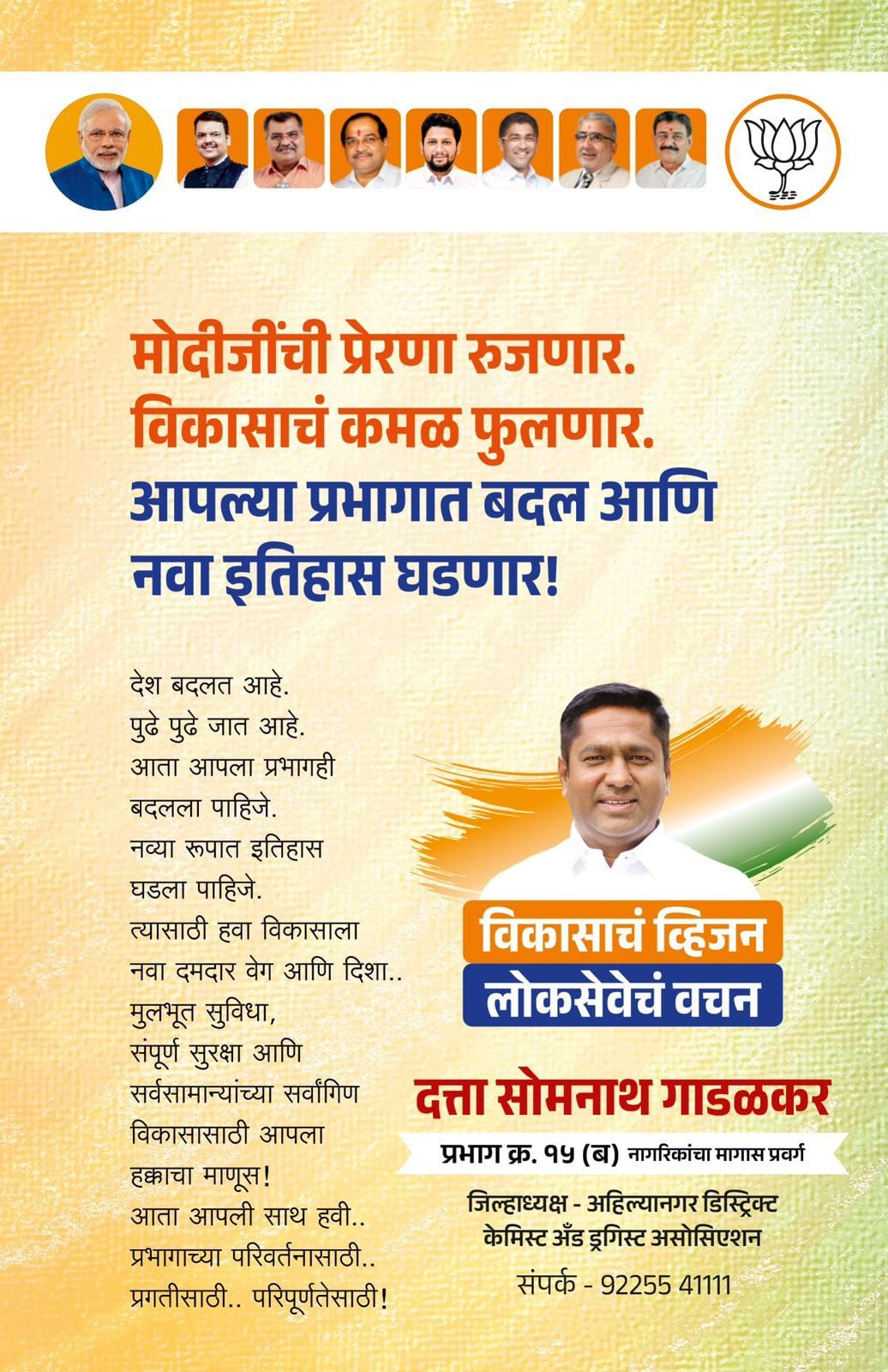 प्रभाग क्रमांक १५ (ब) मधील नागरिकांच्या सर्वांगीण विकासासाठी ठोस व्हिजन आणि लोकसेवेचं स्पष्ट वचन देत दत्ता सोमनाथ गाडळकर यांनी राजकीय मैदानात ठाम पाऊल टाकले आहे. “मोदीजींची प्रेरणा रुजणार, विकासाचं कमळ फुलणार” या विचारधारेवर विश्वास ठेवत प्रभागातील रखडलेली विकासकामे पूर्ण करून नव्या परिवर्तनाची सुरुवात करण्याचा निर्धार त्यांनी व्यक्त केला.